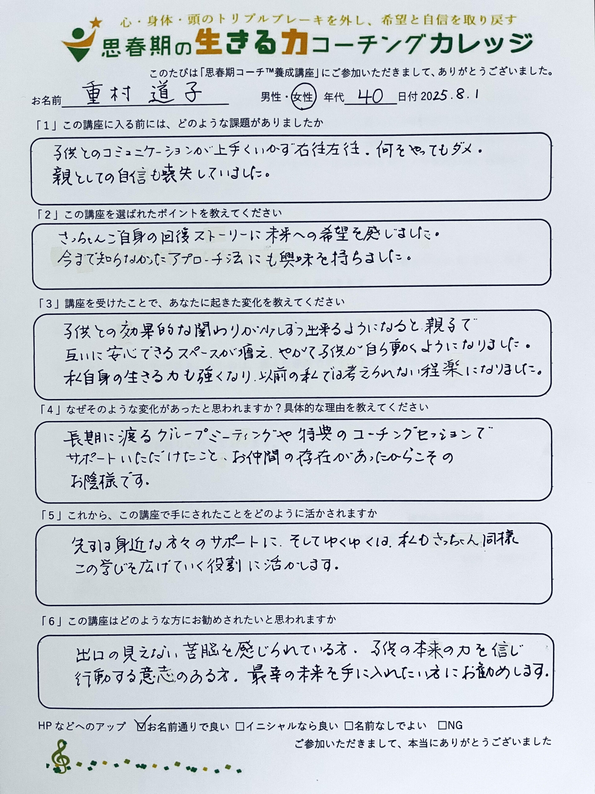 202509ぴっちちゃん 2025年9月8日 最終更新日時 : 2025年9月8日 佐藤 FacebookXBlueskyHatenaCopy 子育てに役立つ、LINEメルマガのご登録はこちらからどうぞ! 今なら「プレゼント」とコメントするだけで『親子関係がびっくりするほど改善する!ラクラクコミュニケーション』PDFが届きます♪身体・心・頭のブレーキを外し、不登校さえ解決する「思春期の子どもと最幸家族になる講座」お子さんの「やる気」の育て方もわかります♪ 思春期コーチにご興味のある方向けのLINEメルマガは、こちらからどうぞ!たった1年で、ずっと求めら続けるプロコーチになる!「思春期コーチ™養成講座」も募集中です! FacebookXBlueskyHatenaCopy